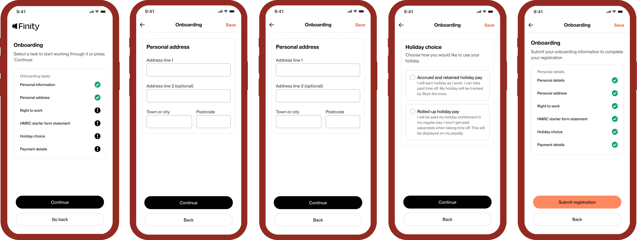 I designed a flexible, simple, non-linear onboarding experience that allows users to skip and return to tasks as it suits them. The design focuses on clarity, with simple language and visual indicators of completion. Users can drop in and out, save their progress and easily return to the flow with their magic link.