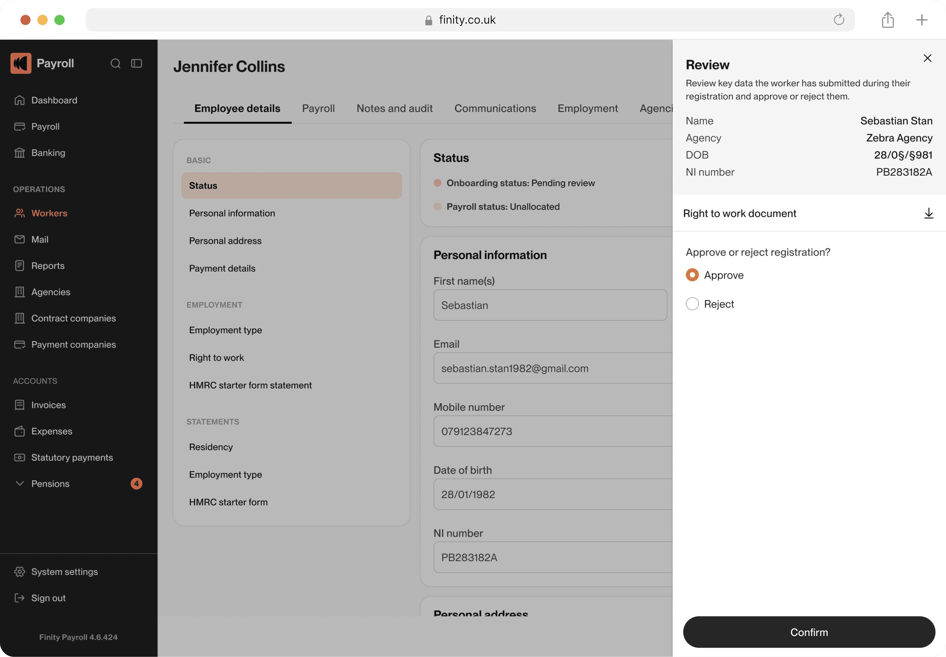 Within the admin portal, I designed an onboarding area inline with the expectations that surfaced during the research phase. The record that they access is the same record they access when the worker is fully onboarded, but provides a clear divide between onboarding and payroll statuses. There are clear indicators of what’s missing and an easy approval flow for worker data.