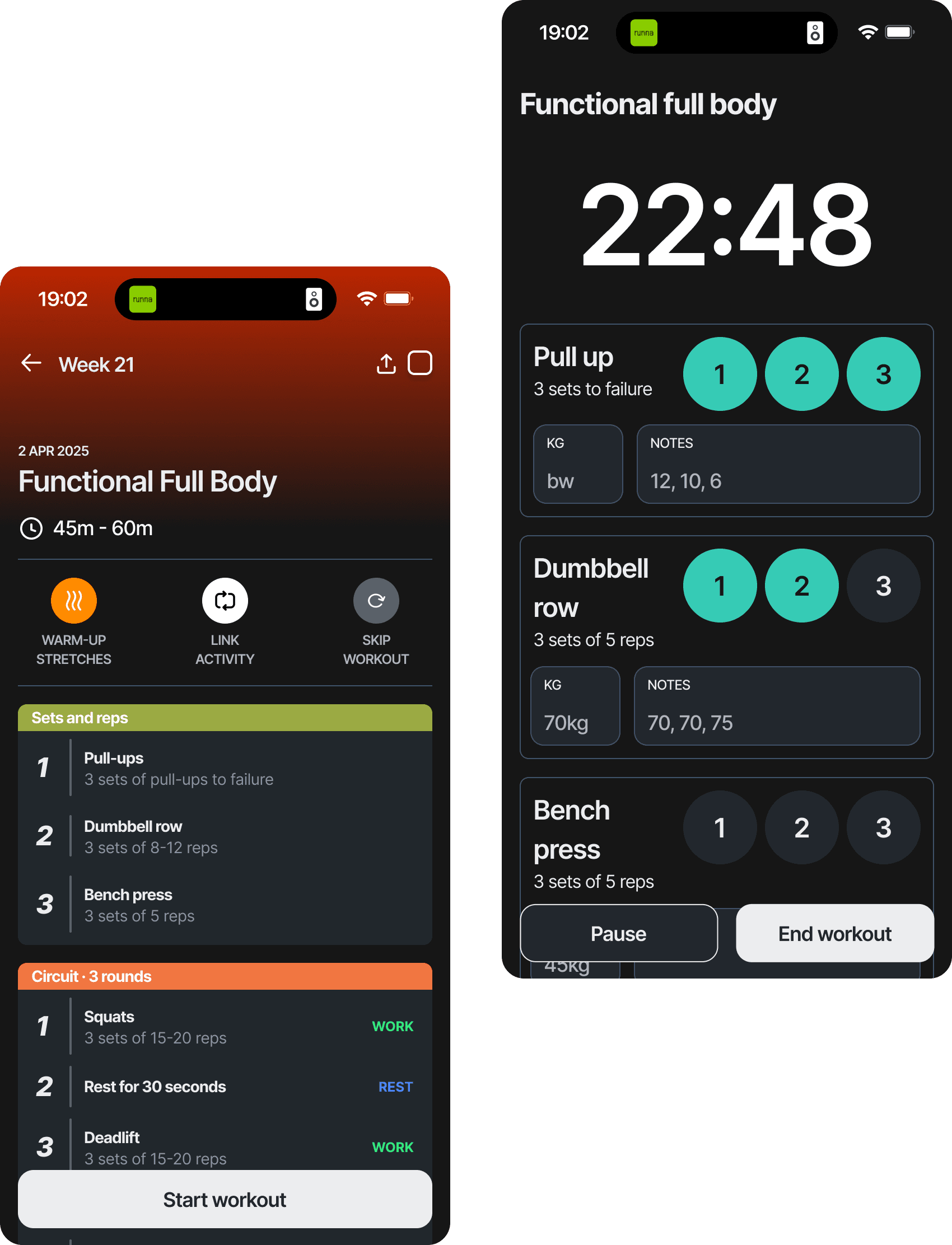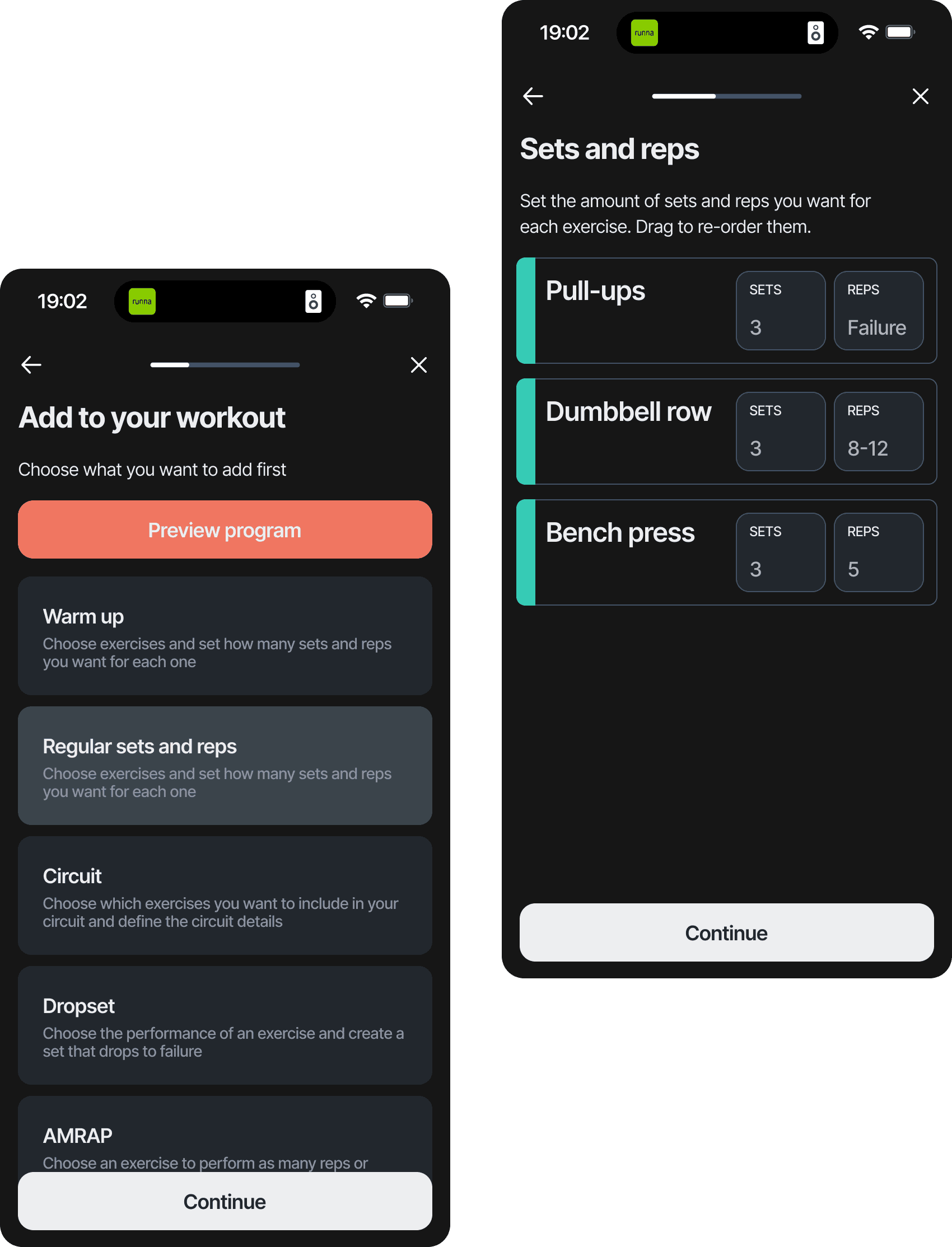 First, a stepper walks the user through setting up a workout repeating the patterns and styles used in setting up a running plan. The idea here is that you could set up a workout in any style, and then assign it alongside your running workouts (how Runna works now).